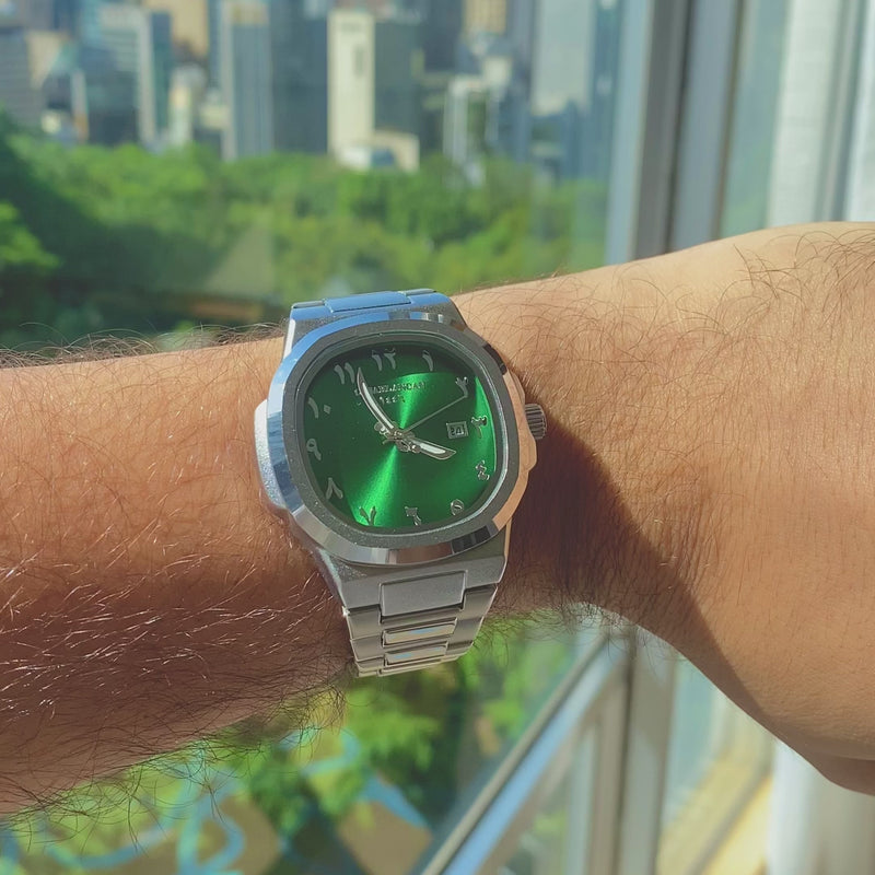 تُعد ساعة الرياض هيريتاج تعبيرًا فنيًا راقيًا يجمع بين الرمزية العربية التقليدية والتصميم العصري المعاصر. يتميز الميناء بأرقام عربية مصممة بعناية لتجسّد أناقة الخط العربي، ومُثبتة على خلفية خضراء نابضة بالحياة تُجسّد جمال العمارة والتراث العربي الأصيل.